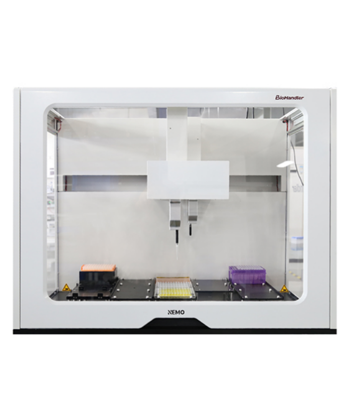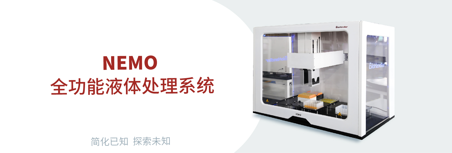 NEMO全功能液体处理系统是一款外形流畅、运动快速、性能稳定且带液面探测的紧 凑型移液系统。单臂单头、单臂双头、双臂双头等多种灵活配置,可自动高效的完成 实验室绝大部分重复且繁杂的实验操作,标准化实验流程以减少人为误差。 产品特点 _Product features 配置灵活:可选择单臂单头、单臂双头和双臂双头等灵活的机器配置,适应用户多种 复杂的应用需求,支持其他多功能机械臂和移液头的不同搭配 灵活移液 :可实现单道、4道、8道的移液方式 移液范围 :具有多种规格的移液头,移液体积涵盖0.5μL—1000μL 移液精准 :含取吸头感应和液面探测功能,保证高效精准地完成全自动流程 操作简易 :控制软件简单易学,可在30min内快速掌握 安全防污 :选配UV和HEPA,可有效保护样品免受污染
