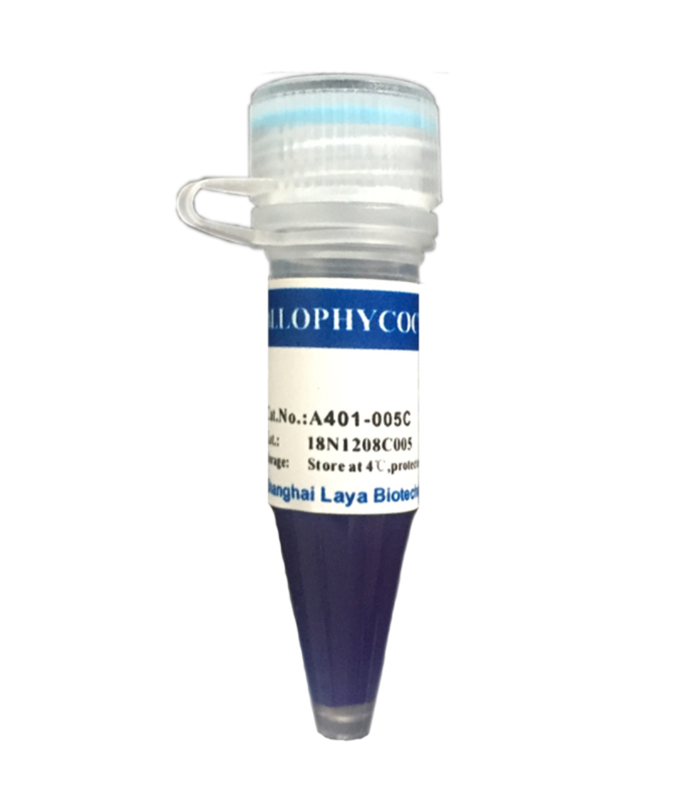 产品名称:别藻蓝蛋白Allophycocyanin(APC ) 结构 : 分子结构为通过硫醚键连接的载体蛋白与开链线性延展的四咯化合物。 分子量:104KD左右 性状:液体、冻干粉 纯度: Amax/A280 > 5.0 Amax/A620>1.5 最大吸收峰: 652 nm±2 nm 荧光发射峰: 662 nm±2 nm 规格:1mg、5mg、10mg、100mg、500mg 稳定性:4ºC可稳定保存12个月。勿冷冻。 用途:用于抗体、蛋白荧光标记,特别是在流式上的应用。