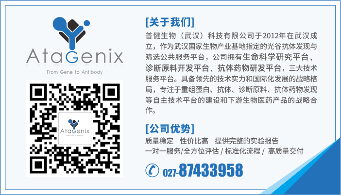普健生物(AtaGenix)于2012年在武汉成立,作为武汉国家生物产业基地公共服务平台—光谷抗体发现与筛选公共服务平台。普健生物(AtaGenix)专注于重组蛋白、抗体、诊断原料、抗体药物发现等自主技术平台的建设和下游生物医药产品的战略合作。经过10年的发展,普健生物已成为一家立足武汉,业务覆盖全国、辐射全球的高新技术服务企业。目前公司拥有4200平米自建实验室(包含800平高标准BSL-2级细胞房),拥有齐全蛋白抗体开发设备500余套,包括高通量蛋白纯化仪、Agilent 流式细胞分析仪,全自动HPLC分析仪,openSPR蛋白、抗体亲和力测定仪,Olympus荧光显微镜, BTX电融合仪,2*7L微生物发酵罐,中试型高压均质机,全自动管式化学发光仪,以及配套的高速离心机,细胞计数仪及大容量细胞培养摇床。公司先后获得荣誉:3551人才计划、高新技术企业、技术先进型服务企业、光谷瞪羚企业