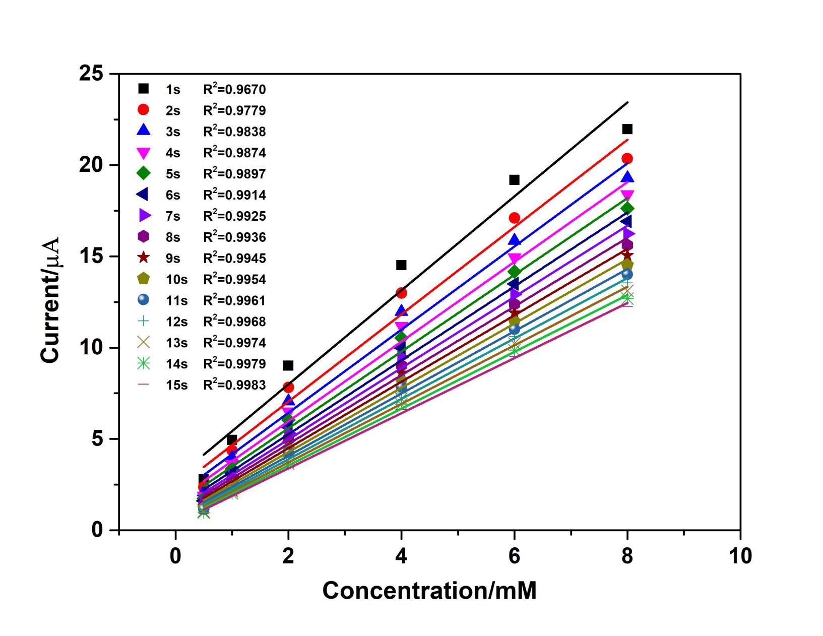 血酮生物传感器在不同血酮质控液浓度下,不同时间段下的线性测试曲线;