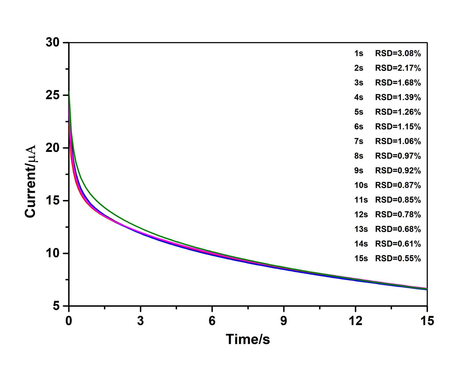 5支血酮生物传感器在同一血酮质控液浓度下,不同时间段下的 i-t测试曲线及RSD;