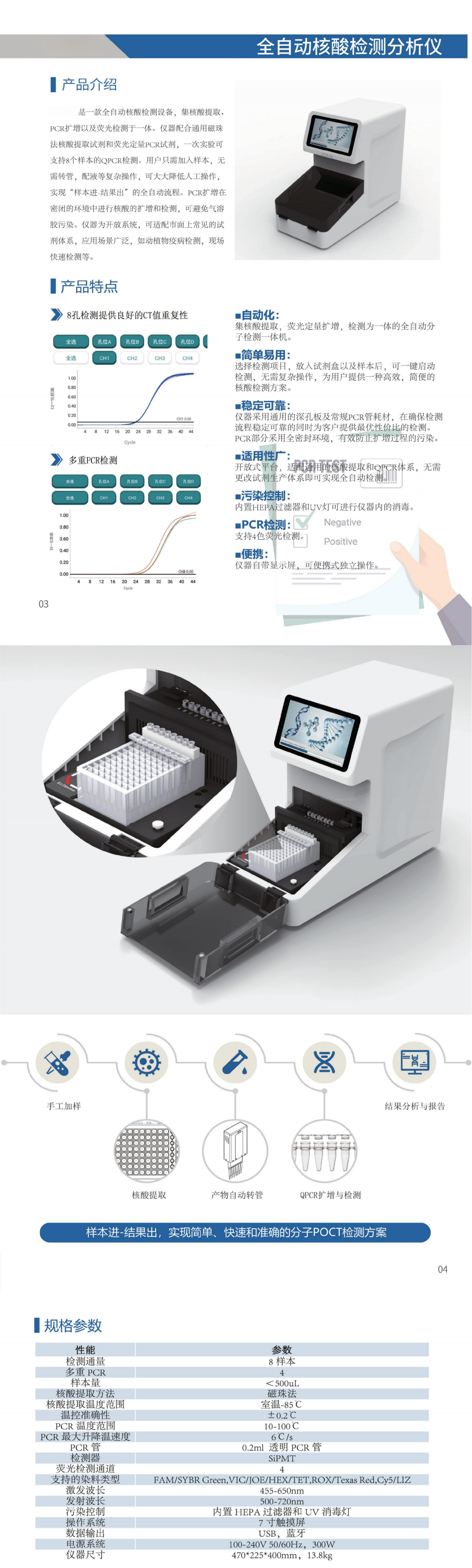 PCR扩增以及荧光检测于一体。仪器配合通用磁珠法核酸提取试剂和荧光定量PCR试剂,一次实验可支持8个样本的QPCR检测。用户只需加入样本,无需转管,配液等复杂操作,可大大降低人工操作,实现“样本进-结果出”的全自动流程。PCR扩增在密闭的环境中进行核酸的扩增和检测,可避免气溶胶污染。仪器为开放系统,可适配市面上常见的试剂体系,应用场景广泛,如动植物疫病检测,现场快速检测等。