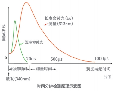本检测系统采用镧系元素标记的纳米微球作为荧光基团标记 抗原或抗体。镧系元素具有长寿命荧光以及所发荧光的Stokes 位移 (最大发射峰与最大吸收峰之间的波长差)非常大(大部分在200nm 以上)的特点,根据样品所包含的荧光物质荧光寿命的不同引入一定的延迟时间(delay time),待短寿命的背景荧光完全淬灭后,再对长寿命的特异性荧光信号进行测定,有利于消除样本及环境中的荧光 物质对检测结果的影响。