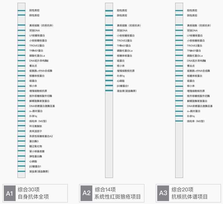 阳性质控、阴性质控、真核细胞(抗核抗体)、双链DNA、U1核糖核蛋白、小核核糖核蛋白、TROVE2蛋白、TRIM21蛋白、磷酸化蛋白La、DNA拓扑异构酶I、着丝点、组氨酰-tRNA合成酶、核糖体核蛋白、组蛋白、核小体、增殖细胞核抗原、核外核糖核酸外切酶、解螺旋酶家族蛋白、DNA依赖蛋白激酶亚基、a-胞衬蛋白、补体1q、线粒体(M2型)、环瓜氨酸肽、类风湿因子、异质性核糖核蛋白A2、蛋白酶3、髓过氧化物、肾小球基底膜、弹性蛋白酶、心磷脂、B2糖蛋白1、凝血素(凝血酶原)
