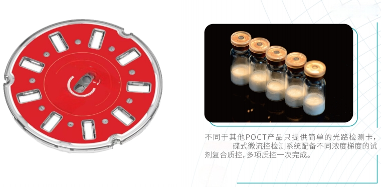 不同于其他POCT产品只提供简单的光路检测卡,本公司碟式微流控检测系统配备不同浓度梯度的试剂复合质控,多项质控一次完成。