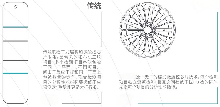传统联检干式层析和微流控芯片卡条,最常见的如心肌三联项目,多个检测项目串联包被于同一个平面上,不同项目之间由于反应干扰和同一平面上包被数量的竞争,联合检测项目的分析性能指标要远低于单项测定;重复性更是大打折扣。