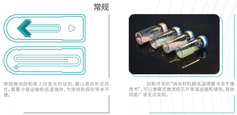 常规微流控和单人份发光的试剂,都以液态形式存在,需要冷链运输和低温储存,为使用和保存带来不便。