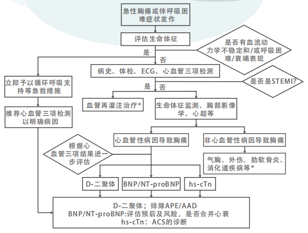 《急诊胸痛心血管标志物检测专家共识》2022年版:对于胸痛或伴有呼吸困难为主诉的急诊和重症患者,应尽快抽血检测心血管三项标志物(hs-cTn、BNP/NT-proBNP、D- 二聚体)以协助临床对患者进行快速分类、诊断、排除诊断、快速治疗,同时准确快速地识别高危患者,确定严重“致死性”胸痛的病因,包括 AMI、AAD和 APE,并同时评估是否伴有心力衰竭。