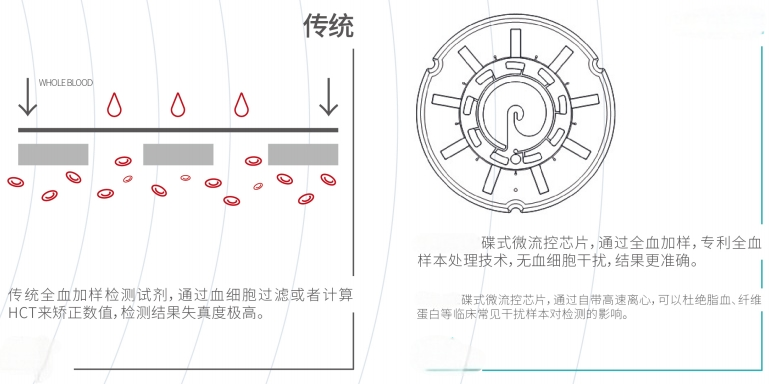 传统全血加样检测试剂,通过血细胞过滤或者计算HCT来矫正数值,检测结果失真度极高。