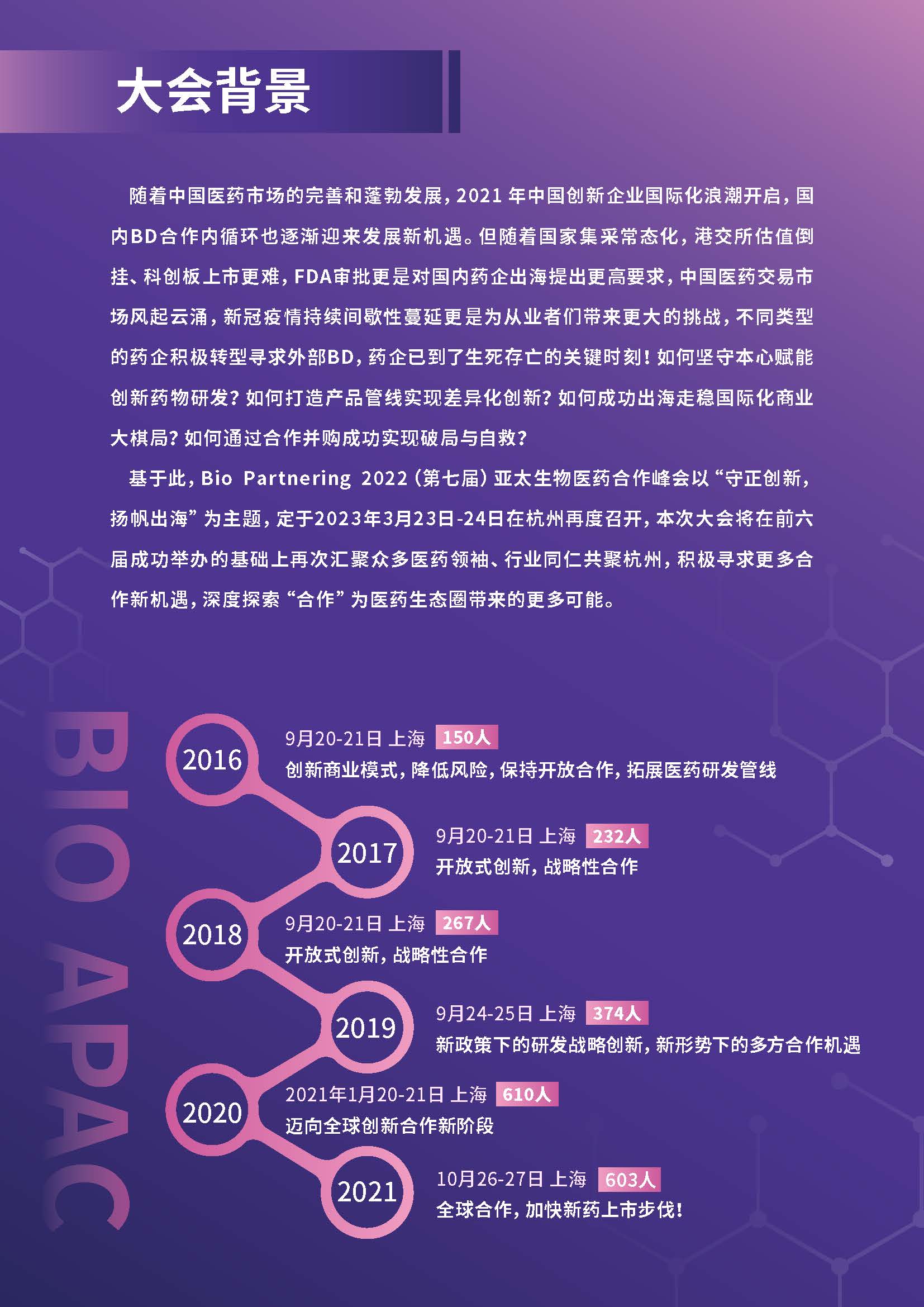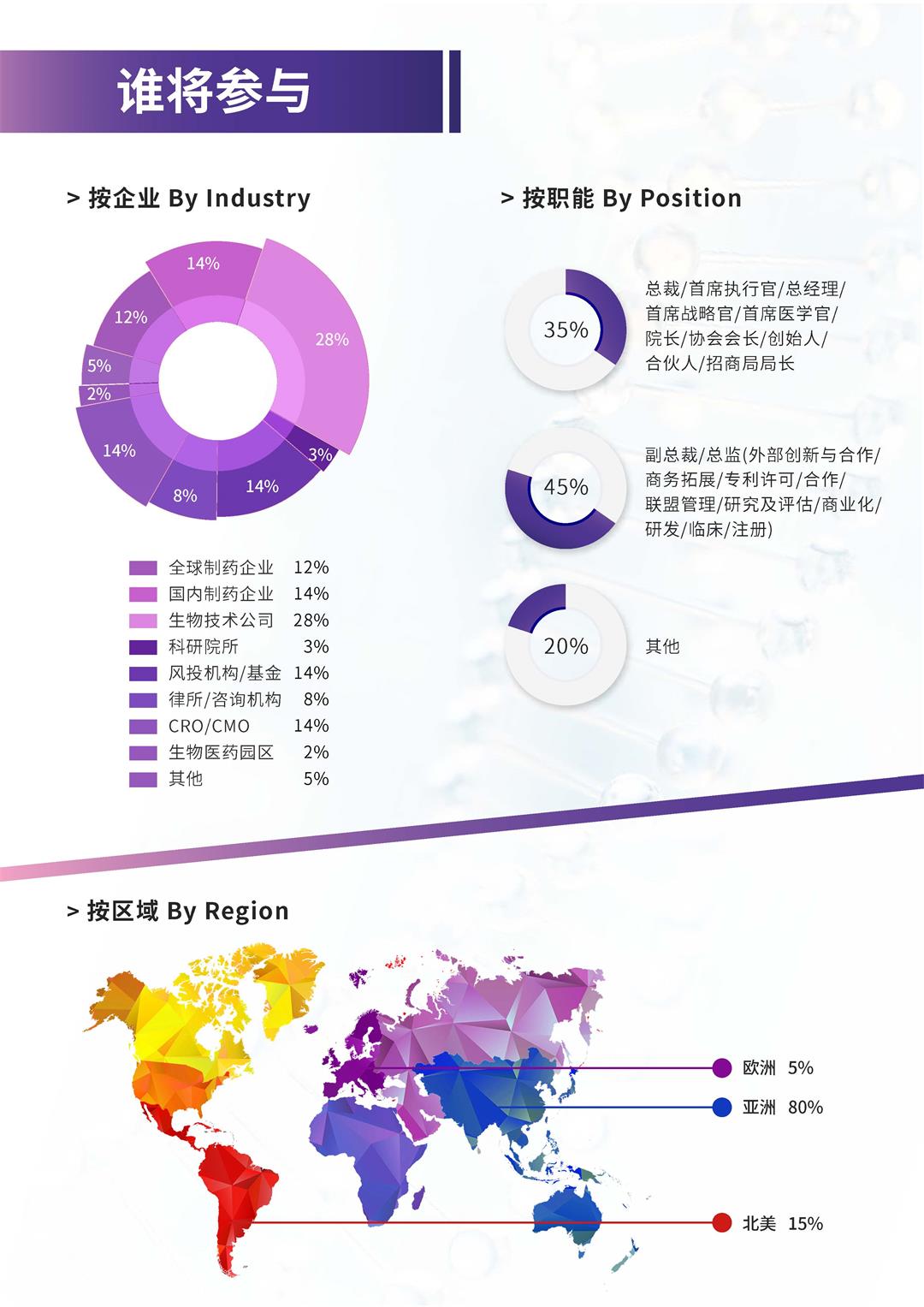 关注医药合作的年度品牌盛会,深度聚焦药企创新出海新机遇 特设新药出海与跨境合作、产品创新与商业模式专场,洞察医药合作新风向 更有投融资与项目估值、BD交易实战演练、路演专场,BD交易过程深度剖析 80+众多医药领袖,650+行业同仁, 积极寻求合作新机遇与新趋势!