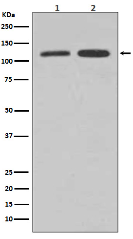 Western blot analysis of Vinculin expression in (1) HepG2 cell lysate; (2) HeLa cell lysate. |