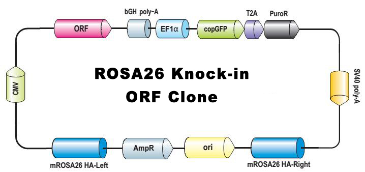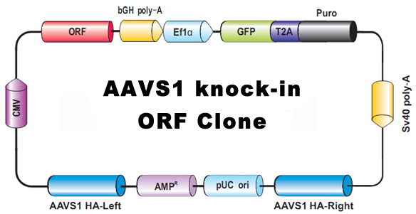 | 多种 | 人类 AAVS1 或小鼠 ROSA26 ORF 敲入克隆 | 由 CMV 启动子启动 ORF 表达。能将 ORF 或您的目的基因敲入人类 AAVS1 或小鼠 ROSA26 safe harbor 位点。 |