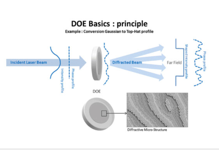 DOE衍射光学元件(Diffractive Optical Elements)是基于光的衍射原理,利用特殊的衍射设计软件进行设计,并通过传统半导体芯片制成工艺或者纳米压印,纳米注塑工艺,在玻璃,塑料基片上(或传统光学器件表面)刻蚀产生台阶型或连续浮雕结构(一般为光栅结构),形成同轴再现、且具有极高衍射效率的一类光学元件。DOE通过不同的设计可控制光束的发散角和形成光斑的形貌,实现输出光束形成特定图案的功能。