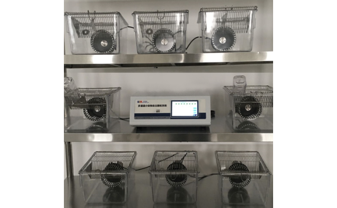 多通道小动物自主跑轮是啮齿类动物自主运动装置,它由转轮组件、笼体、以及转动方向速度传感器组成。它是研究动物生活节律实验必备工具。多通道自主活动轮可以同时记录8个鼠笼,效率大大