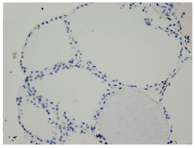 Immunohistochemical analysis of paraffin-embedded Thyroid Carcinoma tissue -with anti-BRaf (V600E) monoclonal antibody (Cat. # 26039). Tissue samples were fixed with paraffin. Samples were then incubated with primary antibody (1: 100) overnight at 4°C. An HRP-conjugated Goat anti-mouse IgG (dilution 1: 50) was used as the secondary antibody. Allele-specific PCR validated to be Negative for BRAF V600E.