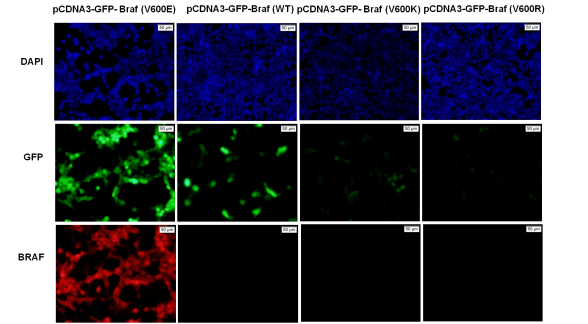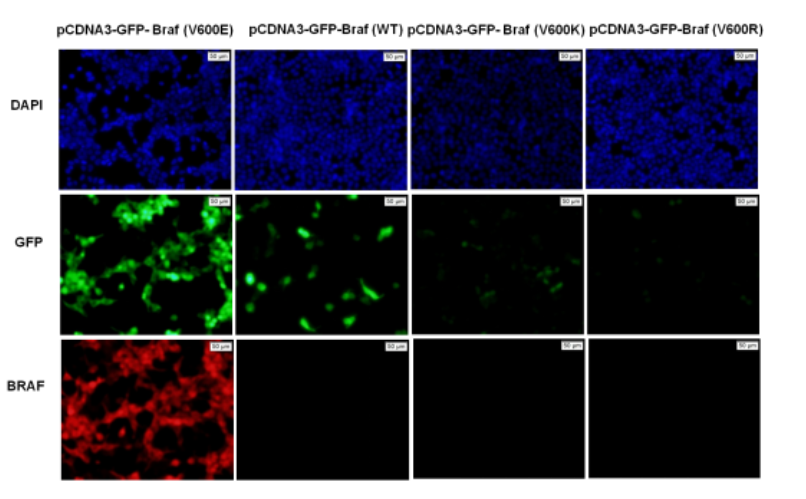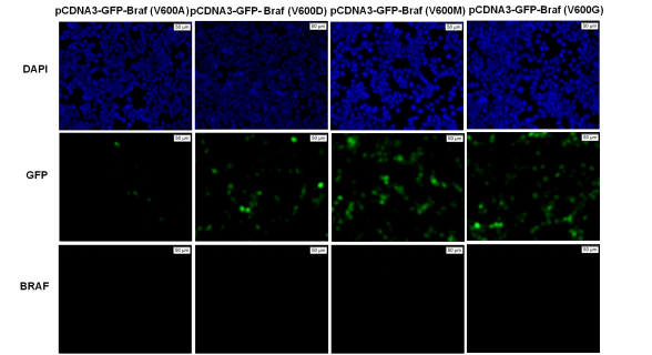 Immunofluorescence of cell expressing BRaf protein with anti-BRaf(V600E) antibody . HEK293T cells were transfected with pCDNA3-GFP- B-Raf( V600E )plasmid,pCDNA3-GFP- B-Raf( WT )plasmid, pCDNA3-GFP- B-Raf( V600K )plasmid,pCDNA3-GFP- B-Raf( V600R )plasmid, pCDNA3-GFP- B-Raf( V600A )plasmid,pCDNA3-GFP- B-Raf( V600D ) plasmid, pCDNA3-GFP-B-Raf(V600M)plasmid, or pCDNA3-GFP-B-Raf(V600G)plasmid, then fixed and stained with anti-B-Raf(V600E) monoclonal antibody (Cat. # 26039).