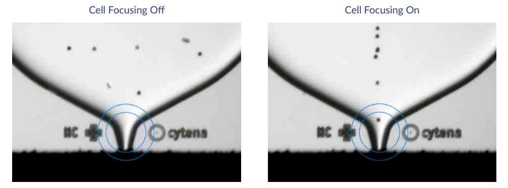 UP.sight增加了Cell Focusing功能, 在分选过程中,开启此功能可以将正要通过喷嘴的细胞轻柔的集中在中间位置,看起来就像细胞被排成了一列,顺次通过一样。该技术能改善光学配件的影响,能够更好的对细胞进行形态学上的分析,提高分选速度。特别在处理稀有类型细胞时,能够减少细胞的丢失率。