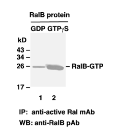 纯化的RalA蛋白 用GDP处理 (lane 1) 或 GTPγS (lane 2).用抗活性的 Ral 进行免疫沉淀(Cat. No. 26913).用 anti RalB rabbit polyclonal antibody(Cat. No. 21033). 做免疫印迹分析。