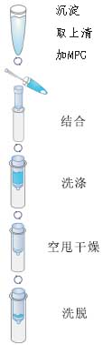 M13噬菌体感染大肠杆菌培养液,离心去除细菌,加入MPG沉淀M-13噬菌体,上柱过滤吸附收集M13噬菌体,加入Buffer MPX裂解噬菌体,吸附单链DNA;加入Wash Buffer洗涤去除杂质,最后用Elution Buffer洗脱DNA。