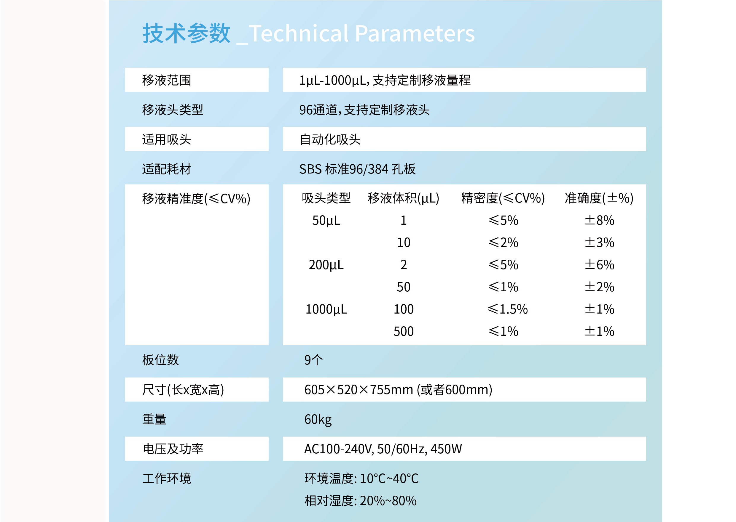移液精准 :96转384孔板加样 96通道移液头高效移液;3种移液头兼顾不同量程;精准度度高