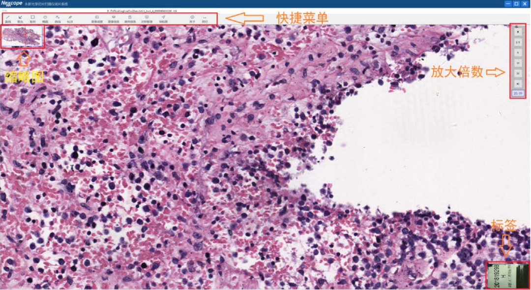 18.5、支持浏览不同扫描倍数下的全景信息数字化玻片,可进行注释、标记,同时可对标注进行导航定位,快速找到标注区域。浏览放大倍率支持固定倍率放大及无级放大,最大可支持100X放大倍率;