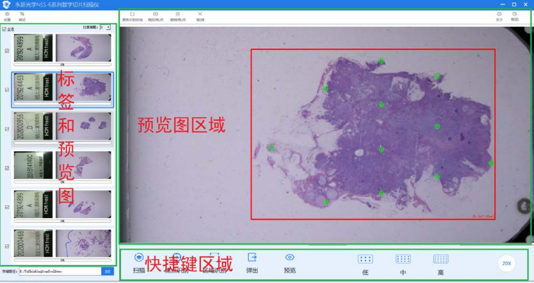 7、扫描区域:可实现智能识别需扫描组织区域,并只对有效区域进行扫描,自动跳过空白区域,亦可根据需要自行框选扫描区域;