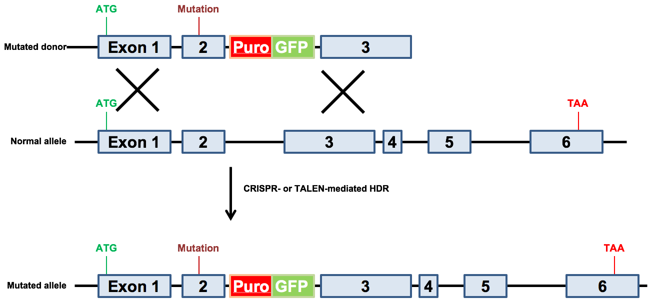 图1. 同源重组介导的基因组编辑。 通过CRISPR/TALEN工具制造DNA 双链断裂介导同源重组,将供体克隆上的报告基因和筛选标记表达结构靶向整合到基因组上的目标位点。