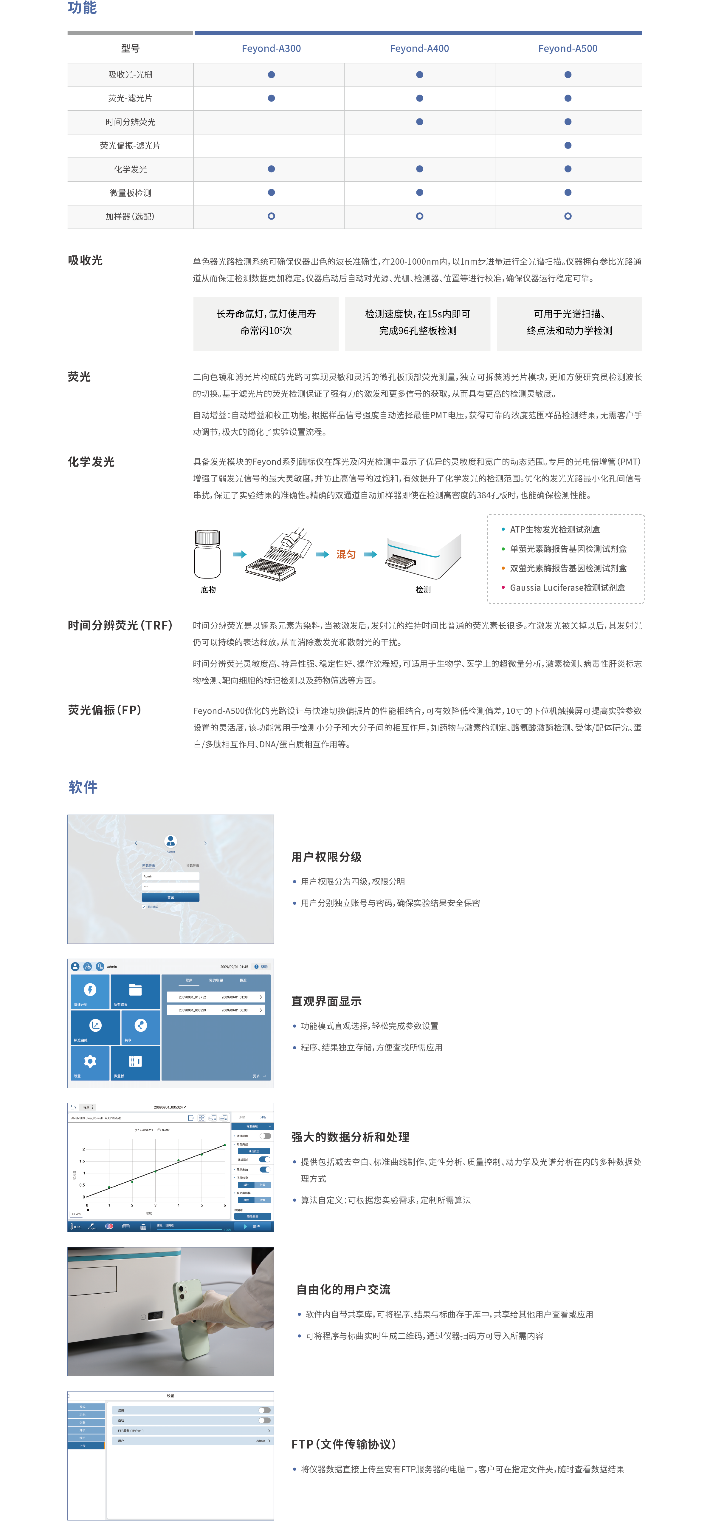 Feyond系列多功能酶标仪,专为医学、生物学及药物研发机构量身设计,满足各种药物开发和生命科学研究需求,高质量的检测性能保证了分子生物学、生物化学及基于细胞学的优质分析。