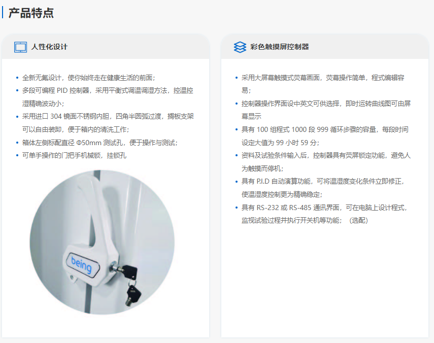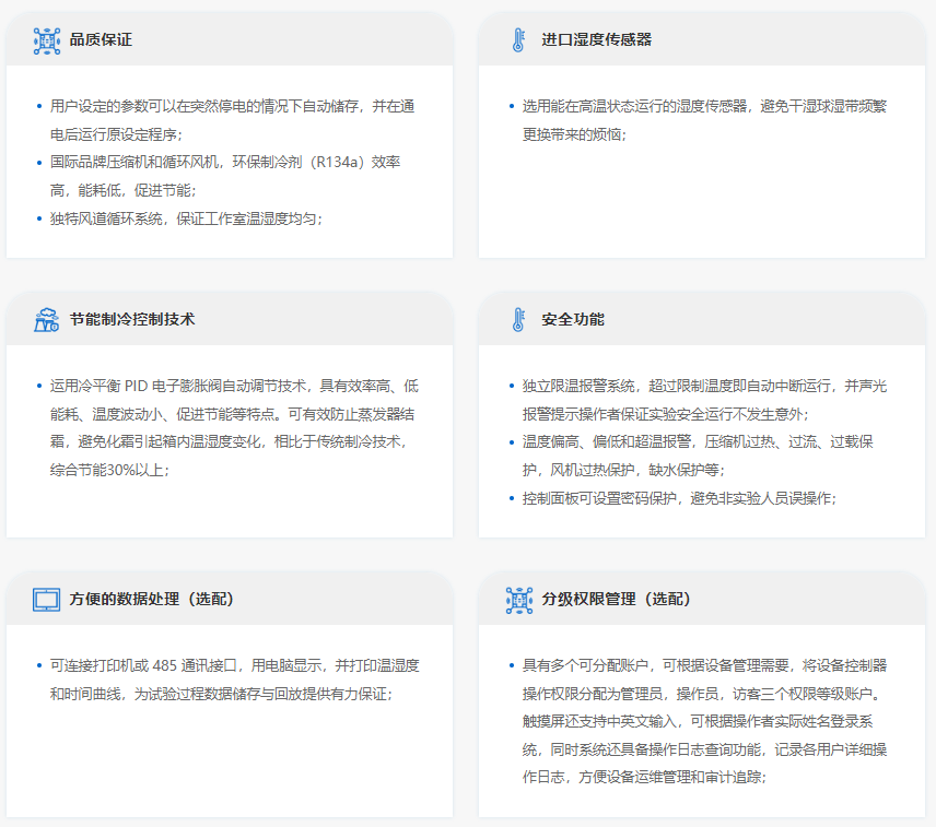 恒温恒湿箱有着精确的温度和湿度控制系统,它为产业研究、生物技术测试提供所需要的各种模拟环境条件。可广泛适用于药物、纺织、食品加工等无菌试验、稳定性检查以及工业产品的原料性能、产品包装、产品寿命等测试。