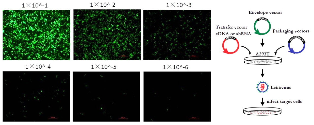 慢病毒载体包含了包装、转染、稳定整合所需要的遗传信息,携带有外源基因的慢病毒载体在慢病毒包装质粒、细胞系的辅助下,经过病毒包装成为有感染力的病毒颗粒,通过感染细胞或活体组织,实现外源基因在细胞或活体组织中表达。