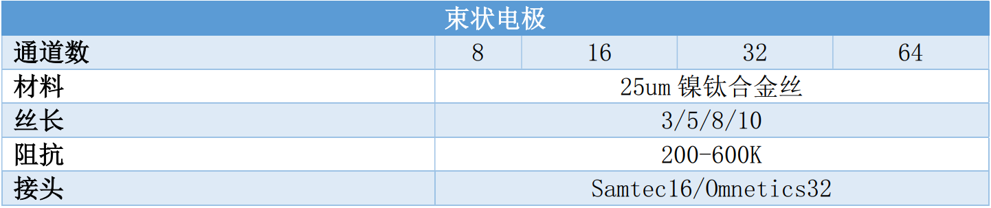 束状电极是将多根电极丝聚在一起,这些触点相互紧贴,能够在不同位置对同一个细胞放电信号进行追踪,从而进行对单个细胞准确的分析,适用于记录Spike,以及进行微电流刺激。