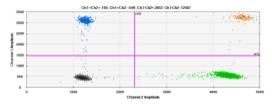 本试剂盒利用微滴式数字PCR技术结合荧光探针技术,对融合基因EML4-ALK(E13; A20)进行检测。微滴式数字PCR系统(ddPCR)在传统的PCR扩增前对样品进行微滴化处理,即将含有核酸分子的反应体系分成上万个纳升级的微滴,其中每个微滴或不含有带有目标基因突变的DNA片段,或者含有一个至数个带有目标基因突变的DNA片段。经PCR扩增后,逐个对每个微滴进行检测,有荧光信号的微滴判读为1,没有荧光信号的微滴判读为0。根据泊松分布原理,进行统计分析。本试剂盒含有内参基因,可控制整个检测过程,排除RNA质量差,逆转录抑制剂,PCR反应抑制剂等造成实验失败的因素,内参基因使用VIC荧光标记,融合基因使用FAM荧光标记。