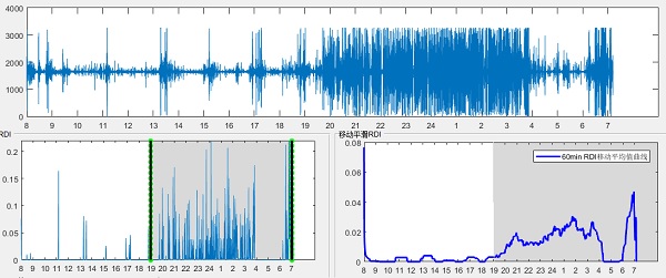 全天RDI值11.8,白天1.08.基本处于睡眠即状态基本一致,晚上RDI为10.74,活动状态变化比较多。