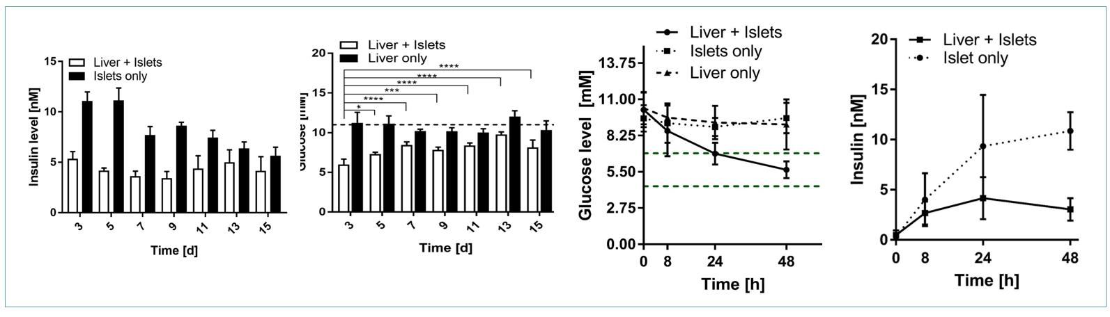 建立串联共培养类器官(胰岛+肝脏)和单独培养类器官(仅胰岛或肝脏),在培养基中连续培养15天,串联共培养显示出稳定、重复、循环的胰岛素水平。而胰岛单独培养的胰岛素水平不稳定,从第3天到第15天,降低了49%。胰岛与肝球体串联共培养中,胰岛可长期维持葡萄糖水平,刺激胰岛素分泌,而单独培养的胰岛,胰岛素分泌显著减少。胰岛分泌的胰岛素促进了肝球体对葡萄糖的利用,显示了串联共培养中类器官之间的功能性交流。在单独培养中的肝球体中,15天内循环葡萄糖浓度稳定维持在~11 mM。而与胰岛共培养时,肝球体的循环葡萄糖在48小时内降低到相当于人正常餐后的水平度,表明胰岛类器官分泌的胰岛素刺激了肝球体摄取葡萄糖。