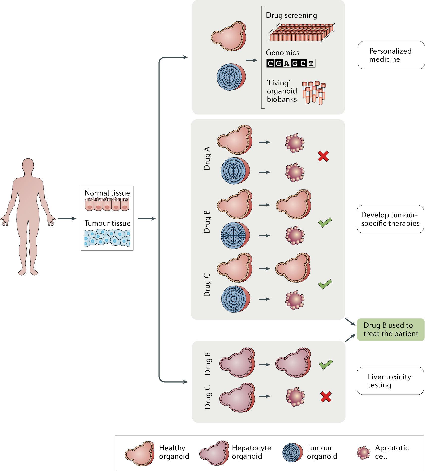 可以从患者来源的健康和肿瘤组织样品中建立类器官。与此同时类器官培养物可用于药物筛选,这可将肿瘤的遗传背景与药物反应相关联。来自同一患者健康组织的类器官的建立提供了通过筛选选择性杀死肿瘤细胞而又不损害健康细胞的化合物来开发毒性较小的药物的机会。自我更新的肝细胞类器官培养物可用于测试潜在新药的肝毒性(临床试验中药物失败的原因之一)。在该实施例中,药物B似乎最适合于治疗患者,因为它特异性杀死肿瘤类器官并且不引起肝毒性。