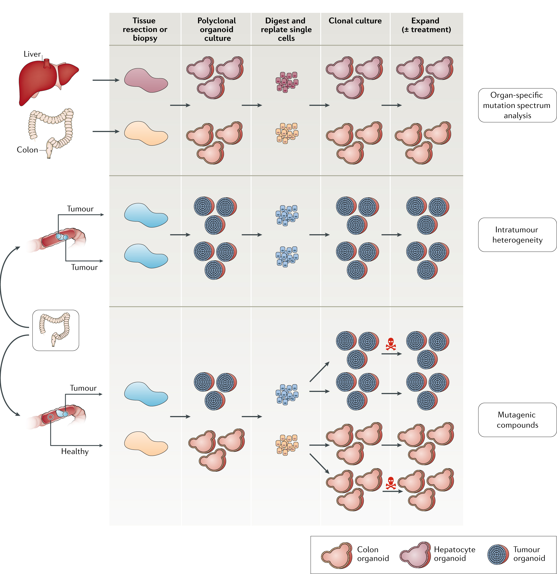来自不同健康器官的类器官的生长,然后对培养物进行全基因组测序,可以分析器官特异性突变谱。通过生长来自同一肿瘤不同区域的类器官,可以用于研究肿瘤内异质性。区域特异性突变谱可以通过类器官的全基因组测序来揭示。使用与上述相似的方法,可以利用类器官来研究特定化合物对健康细胞和肿瘤细胞突变谱的影响。