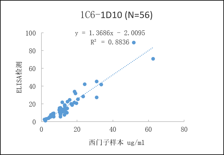 图一:探生DD:1C6-1D10配对抗体测ELISA平台测试抗原和西门子样本线性和相关性良好