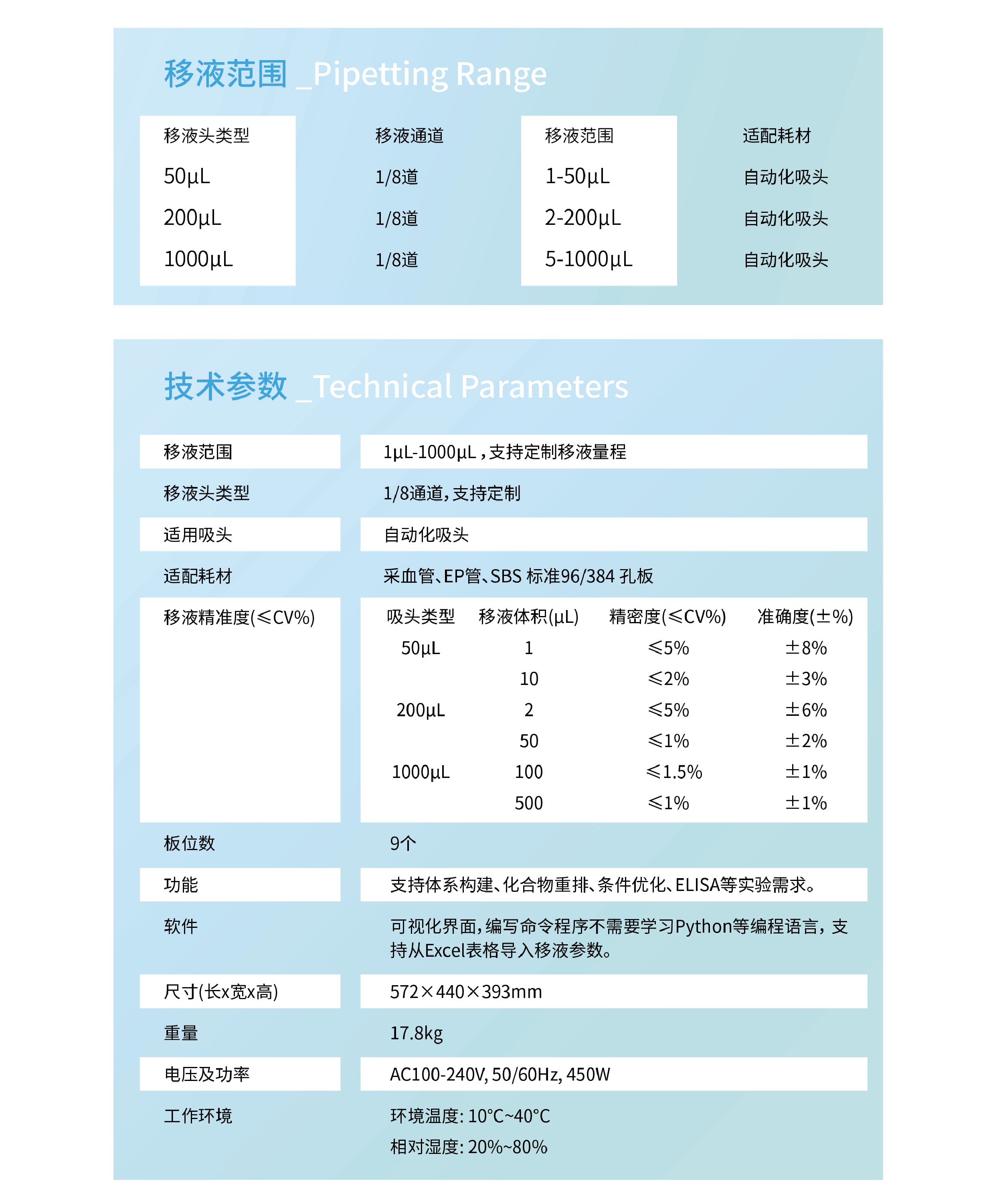 灵活轻巧,专为生物安全柜、 超 净 工 作 台 、通 风 柜 等 有 限 空 间 环 境 设 计,同 时 匹 配 部 分载物平台有限的承重能 力 。能 够 在 狭 小 场 景 中 自 动 完成复杂的液体处理工作, 功能强大。