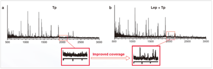 Lys-C+Tp 酶切后,可以在 m/z=2000 时得到吸收峰,而单独的 Tp 酶切在 m/z=2000 时没有吸收峰。该结果表明 Lys-C 可以提高测序覆盖度。