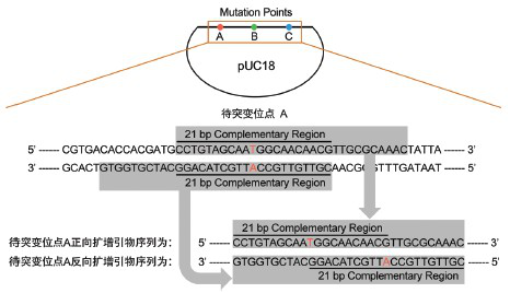 向质粒三个不连续位点引入定点突变,只需设计三对引物将质粒分段扩增即可。引物设计基本原则为:在每个待突变位点处设计部分反向互补的扩增引物对。每对正反向引物5’端包含15-21 bp反向互补区域(GC含量40%-60%为佳),各引物待突变位点至引物3’端区域Tm值高于60℃为佳。所需引入突变可以包含在互补区域内 (需要两条引物上均引入点突变),也可以包含在任一条引物的非互补区域 (只需在一条引物上引入点突变),请勿将突变位点置于引物末端。以向pUC18引入三碱基突变为例,引物设计具体方案如图二所示。