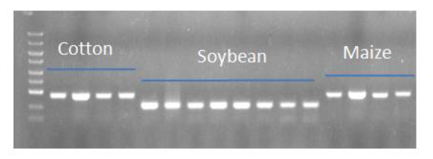 使用本试剂盒针对玉米、大豆、棉花三种样本的多个不同叶片,进行直接PCR扩增实验,扩增产物的琼脂糖凝胶电泳结果如下图所示:
