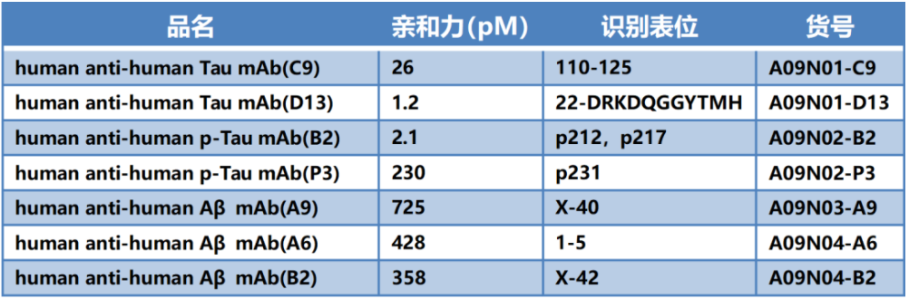百新意生物依托抗体从头发现平台与抗原设计平台,团队目前已完成Tau、p-Tau、Aβ的抗体发现、配对验证、性能测试等工作。整套原料包括7种抗体,特异性、灵敏度、稳定性等指标或可与国内外同类产品相媲美。关于各抗体与不同抗原之间的交叉反应数据,请感兴趣者单独与技术支持联系获取。