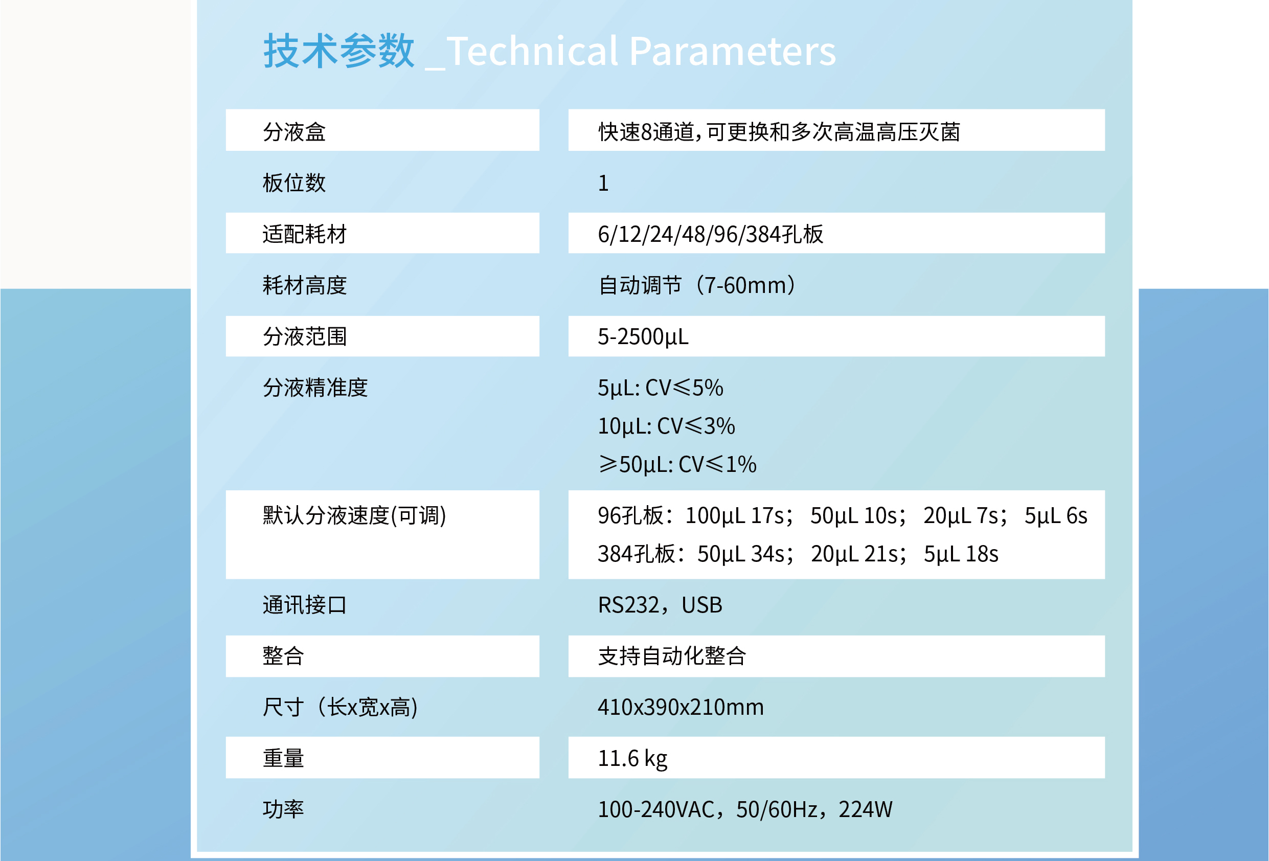 快速精准:支持管路排空,液体回流;加液速度快,完成96孔板20μL/每孔快速分液 小于7s,极大的缩短实验时间和提高通量